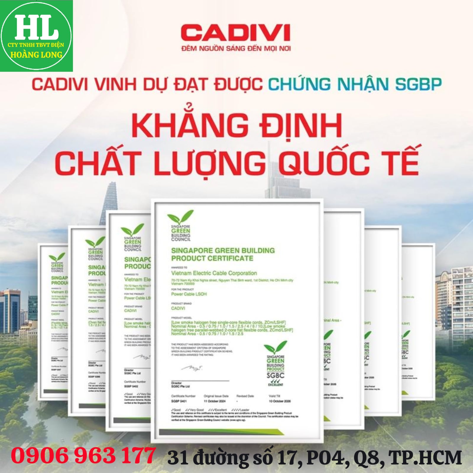 CADIVI đạt chứng nhận SGBP từ Hội đồng công trình Xanh Singapore cho các dòng sản phẩm dây điện không chì
